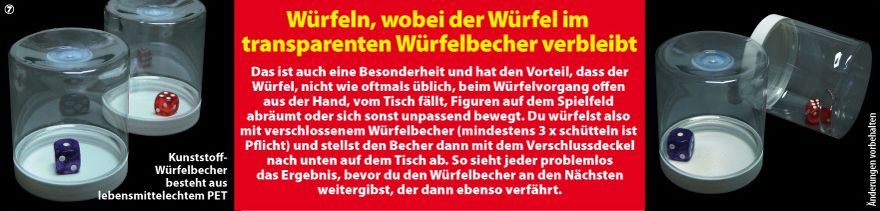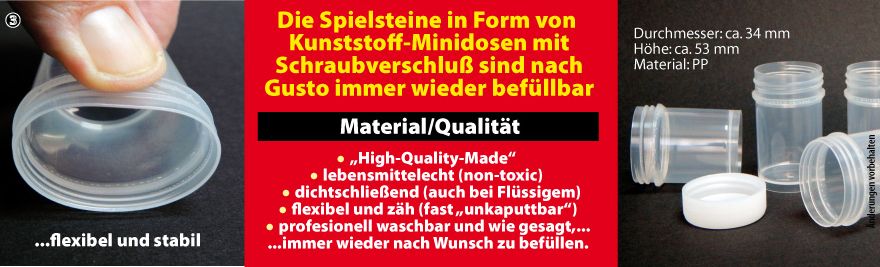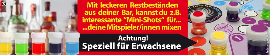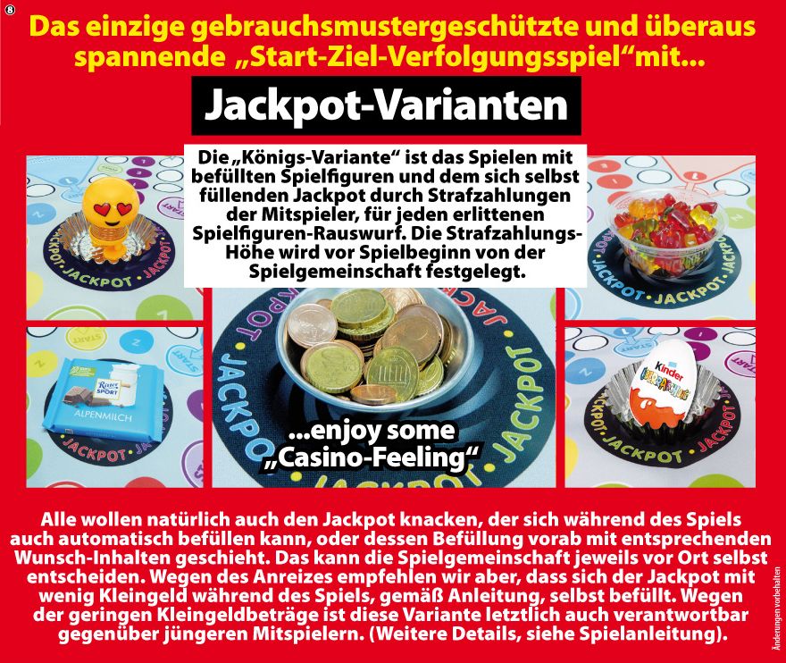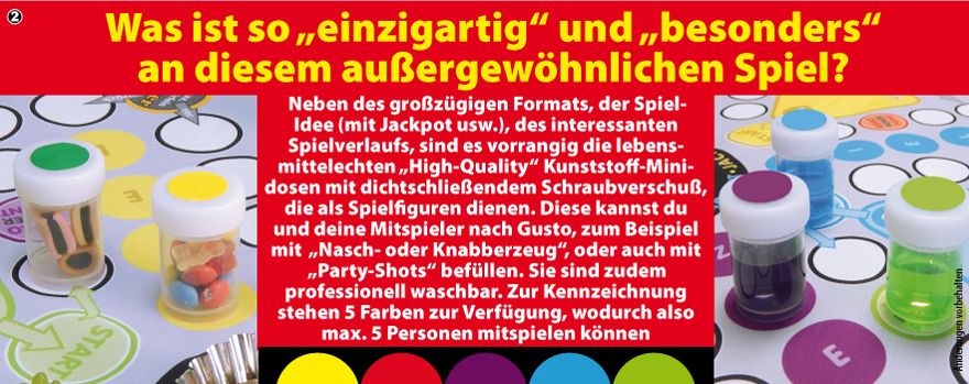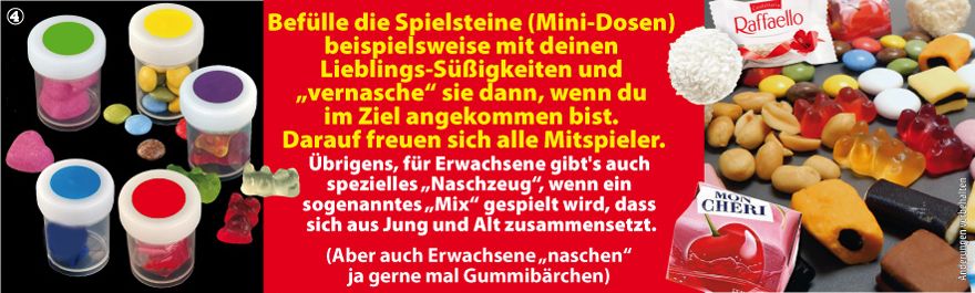 Warum? Weil es das einzige Spiel dieser Art ist, wo ihr mit immer wieder auffüllbaren Spielfiguren in Form von stabilen und lebensmittelechten Mini-Dosen agieren könnt, deren wechselnde Inhalte (beispielsweise Naschzeug, Knabberzeug, Pralinen, Mini-Shots, Mini-Spirits etc.) ihr allein bestimmt und die ihr anschließend (im Ziel) „vernaschen“ dürft. Und weil es auch das einzige Spiel dieser Art mit integriertem „Jackpot“ ist, der sich im Prinzip von selbst während des Spiels befüllen kann und den sich der von allen „ungeliebte“ Sieger, zum Leidwesen der anderen, neidischen Mitspieler, letztlich auch noch „einverleiben“ darf. Aber nur dann, wenn er taktisch richtig, raffiniert, smart und trickreich bzw. auch mal unorthodox gespielt hat und gegebenenfalls auch die Joker-Poker-Möglichkeiten „glücklich“ nutzen konnte.