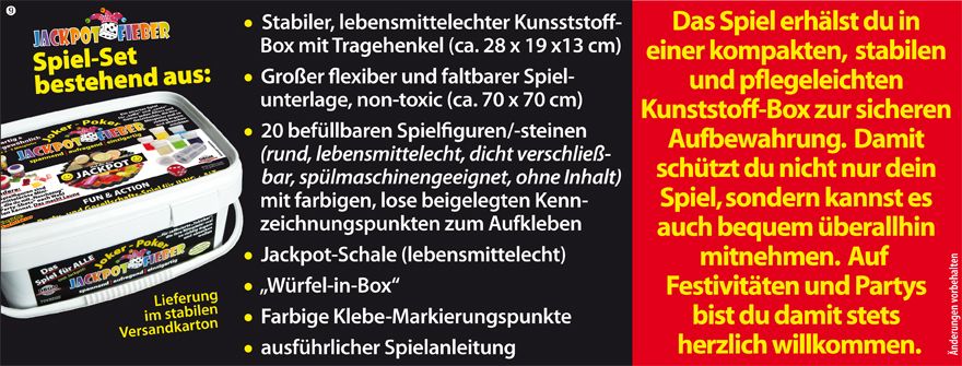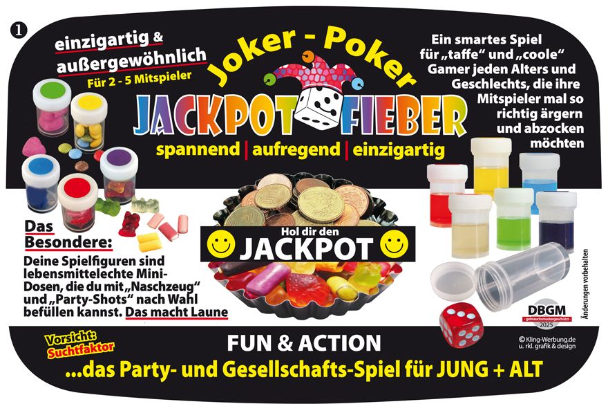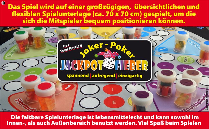 Schön, dass ihr euch für unser spannendes, aufregendes und einzigartiges wie auch gebrauchsmustergeschütztes Party- und Gesellschaftsspiel mit Jackpot und Casino-Feeling interessiert. Ihr werdet nicht enttäuscht sein und ihr (ob jung oder alt - gerne auch in Kombination) werdet garantiert viel Spaß damit haben.